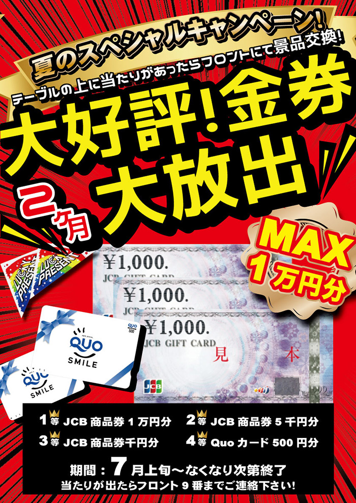 ☆7月上旬~夏のスペシャルキャンペーン☆ 2か月連続金券大放出!! 当たりが出たらMAX1万円分の商品券をプレゼント!