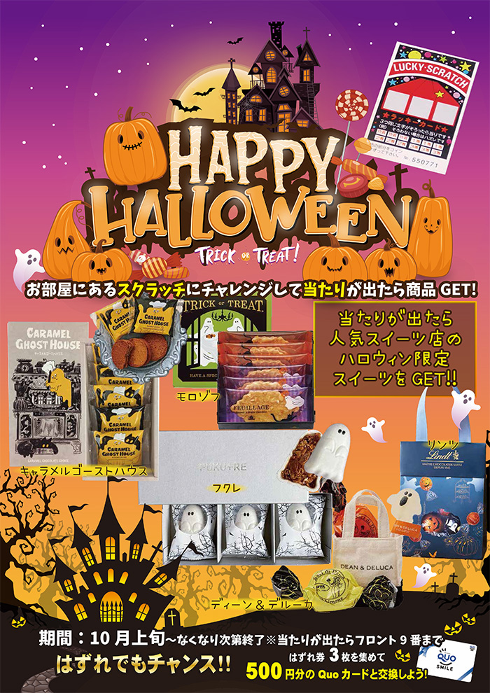 10月のテンセゾンはハロウィンイベントを開催♪ お部屋のスクラッチにチャレンジして、 人気スイーツ店のハロウィン限定パッケージ商品をGET!